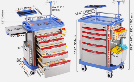 CARRO ROJO 5 CAJONES CON PORTA DESFIBRILADOR Y PORTA VENOCLISIS VEVOR