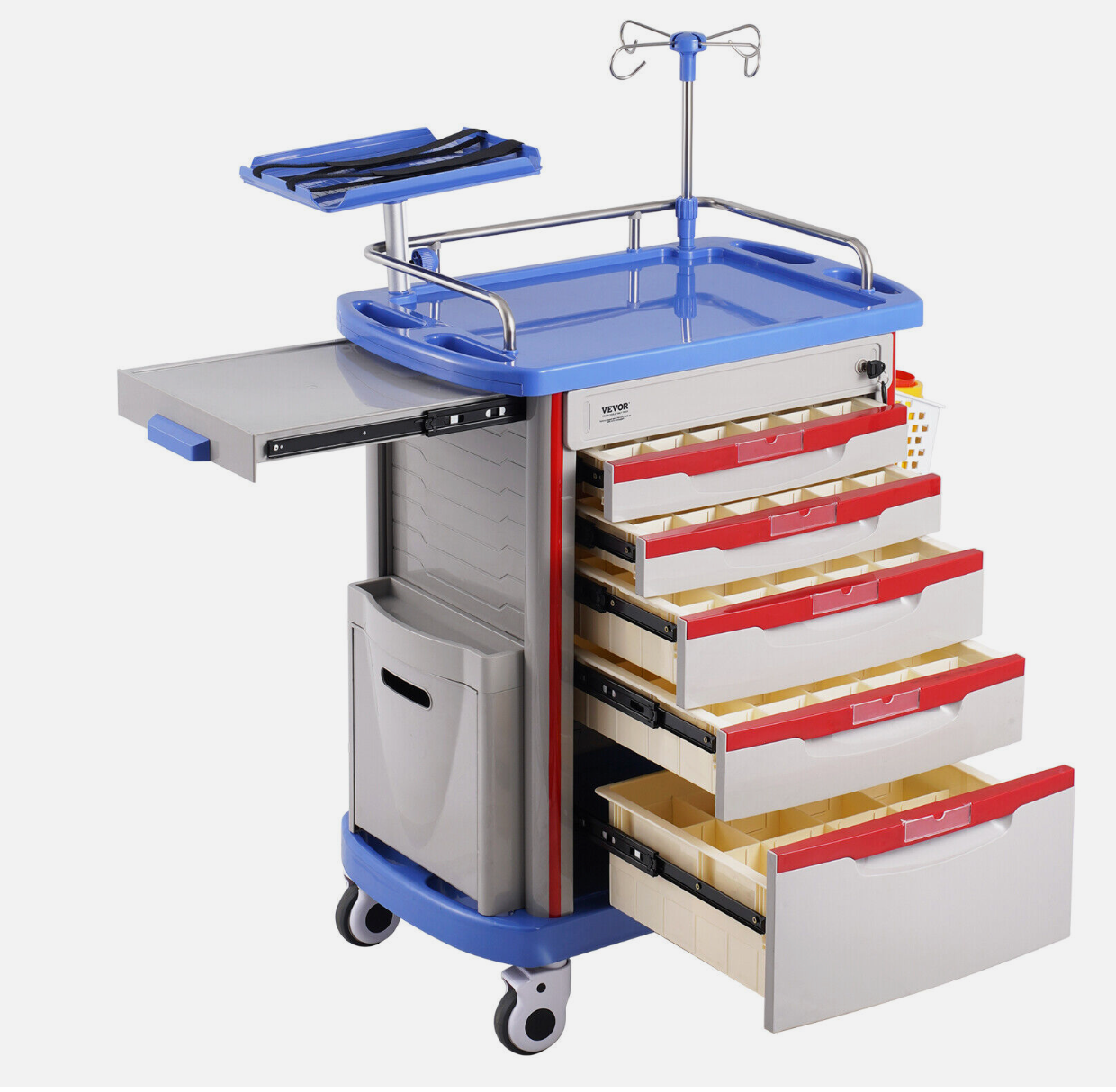CARRO ROJO 5 CAJONES CON PORTA DESFIBRILADOR Y PORTA VENOCLISIS VEVOR